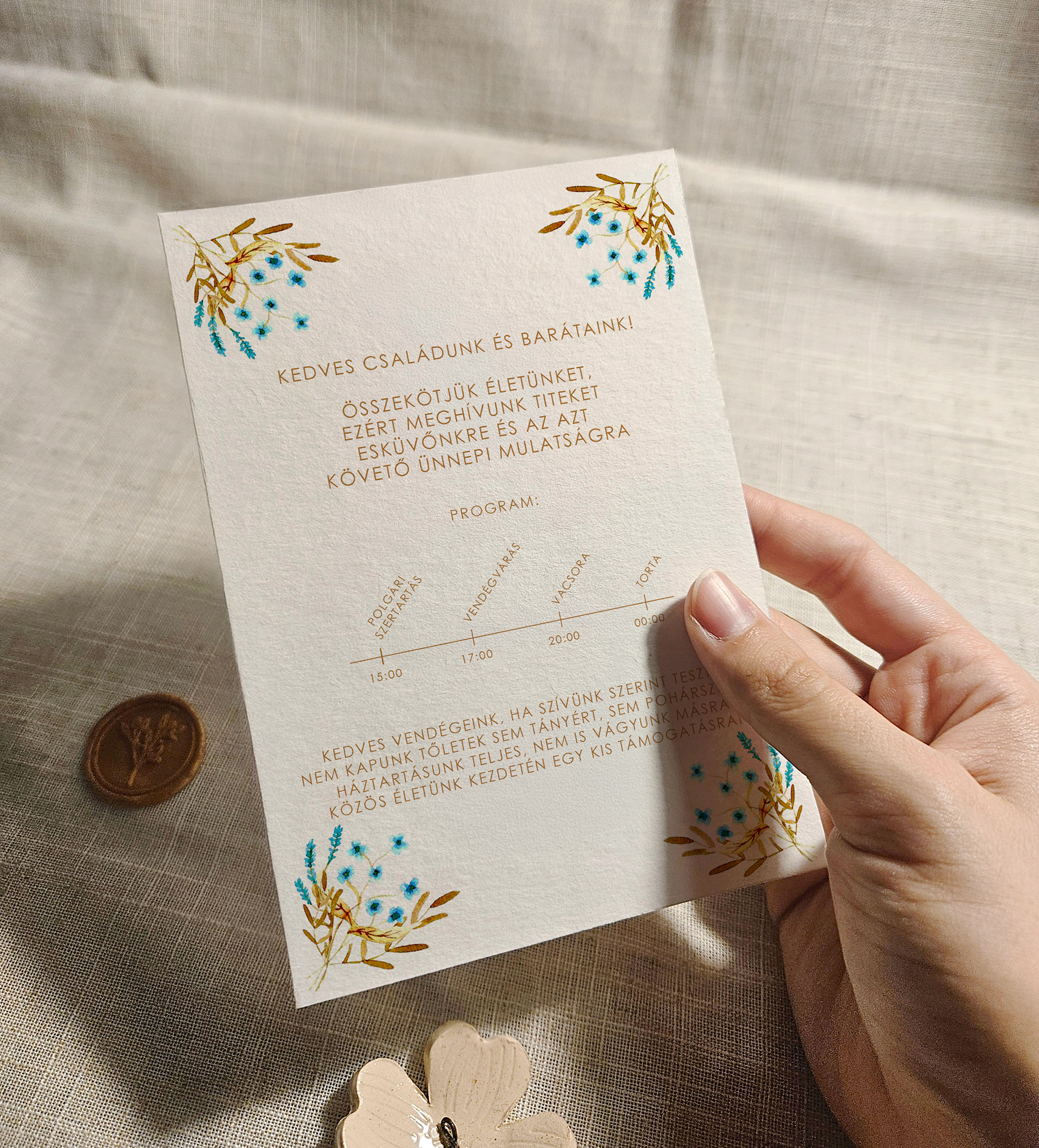 Borítóval és pecséttel + 500 Ft/db áron készítem a meghívókat.
